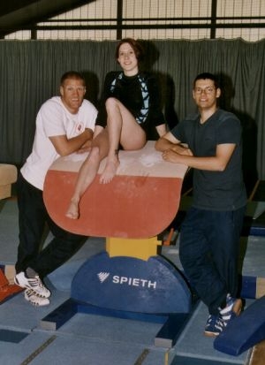 Mittwoch, 17.12.2003 Bodenübung von Nadine Wawrzyniak war das Highlight Ennepe-Süd. (gö.) Die Büttenberger Trainer Fabio Gianfelici und Eiko Rümker (links) freuen sich mit ihrem Schützling Nadine Wawrzyniak über den Gewinn des Bezirksmeistertitels. Foto: Privat